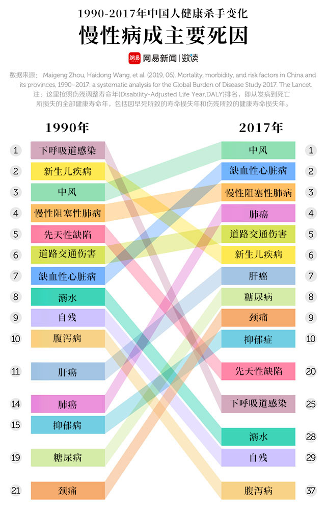 國際權威醫(yī)學雜志《柳葉刀》于2019年6月發(fā)表了一篇論文,分析了1990年到2017年中國34個省份(包括港澳臺)居民的死亡原因。中國人目前的第一大死亡原因,是中風;第三大死亡原因,是肺癌。