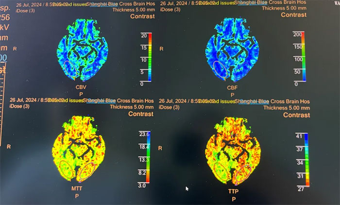 ▲ 頭顱CTP顯示右側(cè)頂枕顳葉局部腦組織灌注較對(duì)側(cè)稍減低
