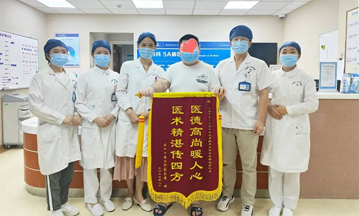 8月8日,在一個“大吉大利”的好日子,上海藍十字腦科醫(yī)院神經(jīng)內(nèi)科5A病區(qū)全體醫(yī)護人員收獲了一面意義特殊的錦旗。“00后”小伙阿泰難掩心中的激動,將錦旗硬塞到李振并主任的手中。