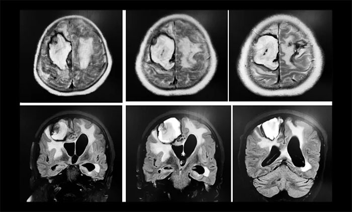 ▲ 入院時,行頭顱MRI示:靜脈竇血栓導(dǎo)致右側(cè)額頂葉、基底節(jié)區(qū)及左側(cè)額葉大面積出現(xiàn)腦積血、腦水腫
