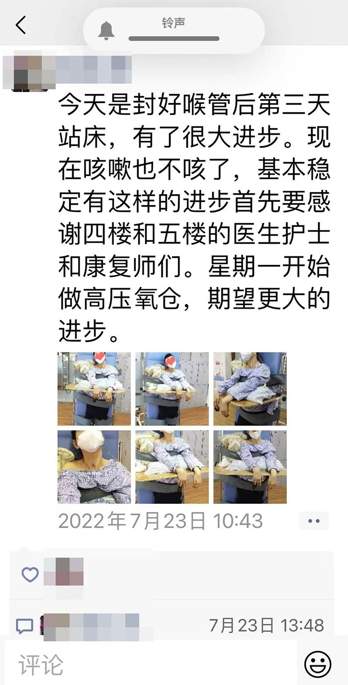 成功封管后的韓女士,迅速轉(zhuǎn)入病情好轉(zhuǎn)“快車道”。如今,她的肺部感染已完全控制,神志逐漸清醒,能簡單完成不少指令性動作。偶爾韓老師也會坐上輪椅,在病區(qū)走廊短暫活動,開心的她總是不忘與偶遇的病友揮手招呼。