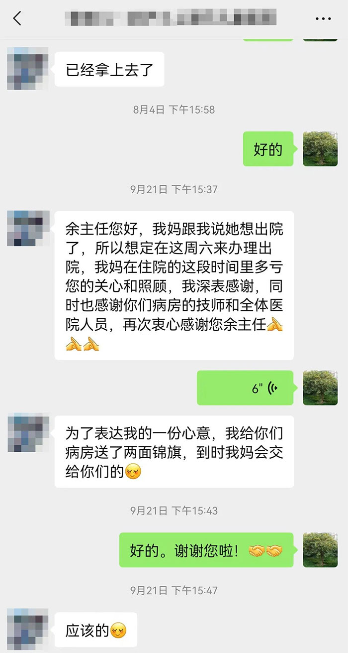 得悉母親的恢復(fù)情況,吳阿姨的女兒也滿心歡喜。作為醫(yī)療界的同行,她對醫(yī)院的技術(shù)、理念和服務(wù)都深為贊同,對于母親的迅速康復(fù)更是滿懷感激,并為此特意定制了精美的錦旗,叮囑吳阿姨一定要親手交給余志良博士。