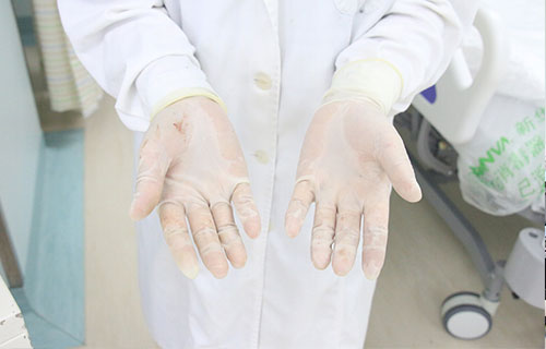 上午9:30,李魯萍開(kāi)始給一名69歲的腦出血患者做纖支鏡治療。ICU有很多這樣的長(zhǎng)期臥床患者,肺部感染嚴(yán)重,咳嗽、吞咽等反射差,需要不定期做治療。一個(gè)小時(shí)后,治療結(jié)束,病房里的溫度不高,李魯萍已經(jīng)全身冒汗,脫下塑膠手套,可滴出汗來(lái)。