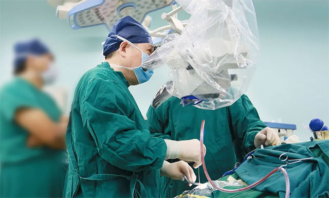▲ 李士其教授通過蔡司顯微鏡(雙熒光)為患者手術(shù)
