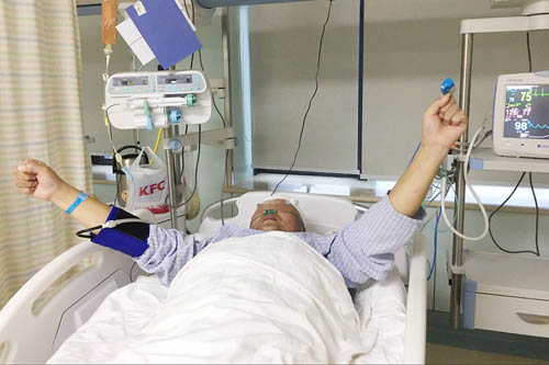 腦瘤手術后第2天,王先生舉起雙臂以顯示他現(xiàn)在狀況良好