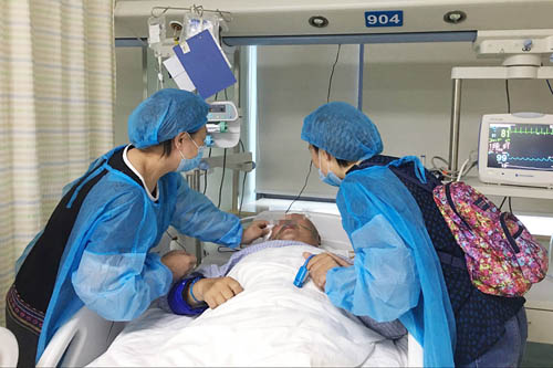 腦瘤手術后,在ICU(重癥監(jiān)護室),家屬為王先生擦拭眼淚