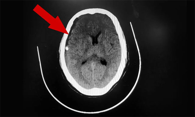 ▲ 患者右側(cè)額顳部顱骨內(nèi)板下方呈新月形高密度影