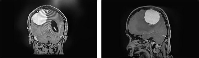 患者頭顱MRI提示,右側(cè)頂部大腦凸面可見一團(tuán)塊狀異常信號影,邊緣清晰,輪廓光整,大小約為6.1×5.7×5.1cm,體積巨大,形同鵝蛋狀;毗鄰額頂葉、基底節(jié)區(qū)見片狀長T1、長T2水腫信號影,鄰近腦組織受壓移位變形,右側(cè)側(cè)腦室受莊變窄,中線結(jié)構(gòu)向左側(cè)偏移。