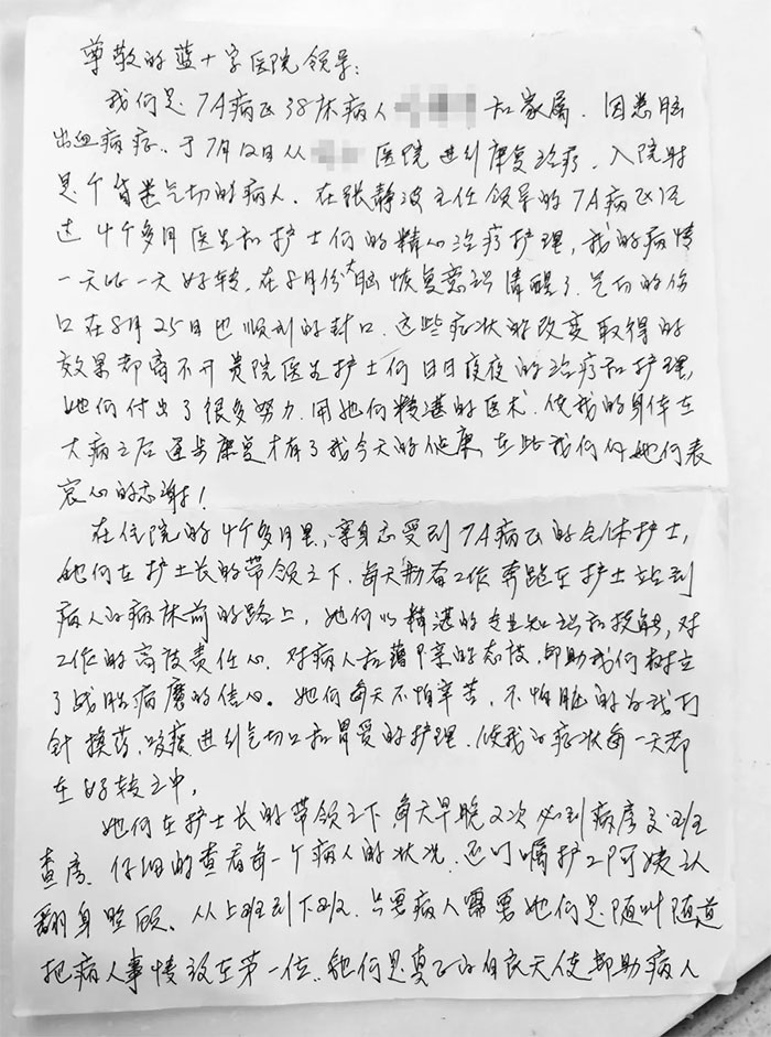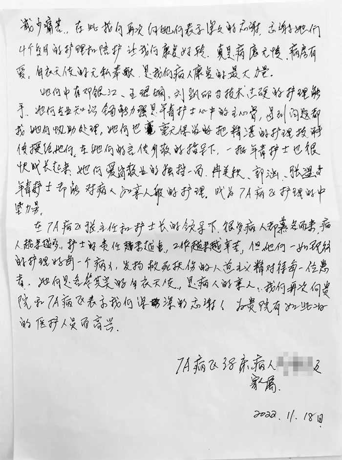 “她們是名副其實的白衣天使,是病人的親人,我們再次向貴院和7A病區(qū)表示我們深深的感謝!為貴院有如此好的醫(yī)護人員而高興。”近日,上海藍十字腦科醫(yī)院神經(jīng)內科7A病區(qū)38床患者家屬,已年近八旬的朱奶奶,再次執(zhí)筆寫就一封感謝信,文中通過情真意切的文字,向7A病區(qū)張靜波主任醫(yī)護團隊表達了真摯感謝。