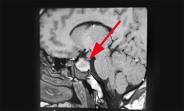 入院時(shí),患者已經(jīng)連續(xù)9天陣發(fā)性頭痛,經(jīng)檢查其左側(cè)眼瞼有輕微下垂,約1米距離時(shí)有視物重影等癥狀,雙眼視力0.2,四肢指關(guān)節(jié)較之前變粗大。針對患者情況,6B病區(qū)主任潘仁龍基于多年臨床經(jīng)驗(yàn)立即作出判斷,急行頭顱鞍區(qū)MRI平掃+增強(qiáng),顯示:蝶鞍顯著擴(kuò)大,鞍底下陷,鞍區(qū)見一不規(guī)則腫塊,大小約1.6*3.2*2.1cm,病變向周圍生長,突入鞍上池,推移視交叉,向下生長,鞍底受壓,向鞍旁生長,海綿竇推擠改變。