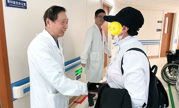 ▲ 一位腦出血患者經(jīng)周教授診斷行保守治療順利康復(fù),激動地握住周教授的手