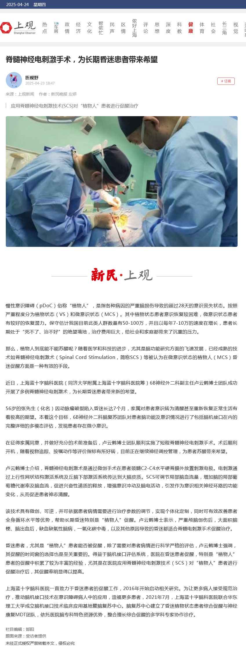 近日,上海藍(lán)十字腦科醫(yī)院(同濟(jì)大學(xué)附屬上海藍(lán)十字腦科醫(yī)院籌)6B神經(jīng)外二科副主任盧云鶴博士團(tuán)隊(duì)成功開展了多例脊髓神經(jīng)電刺激術(shù),為長(zhǎng)期昏迷患者帶來(lái)新的希望。